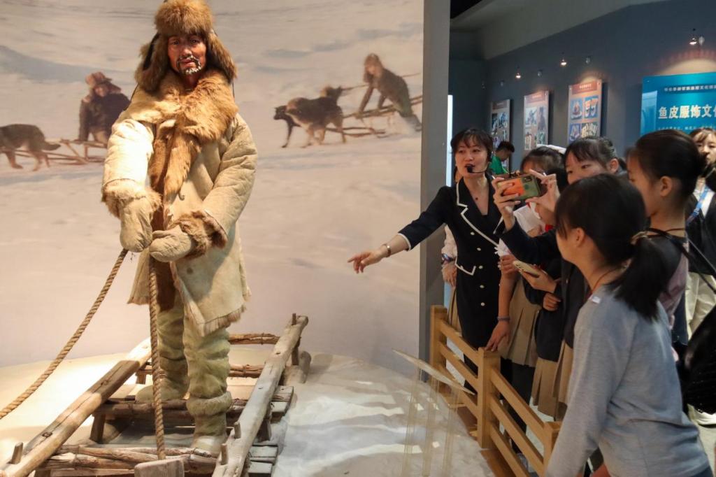 在馆藏文物展,同学们参观了鄂伦春和赫哲两个民族的文物,聆听了文物背后的故事,对黑龙江流域文化、石器时代、古生物化石、中华遗珍、流域内渔猎民族的民族风情和民俗文化有了更加深入的认识。