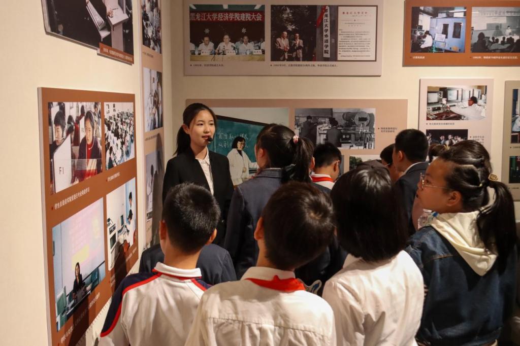 活动伊始,同学们来到黑龙江大学博物馆校史展。同学们在讲解员的讲解下了解了我校从延河边到松花江畔一路走来的红色足迹和改革开放后取得的巨大成就,感受到了我校深厚的文化底蕴和赓续的红色血脉。红色历史与文化的种子悄然生根,深深根植在每一位小朋友心中。